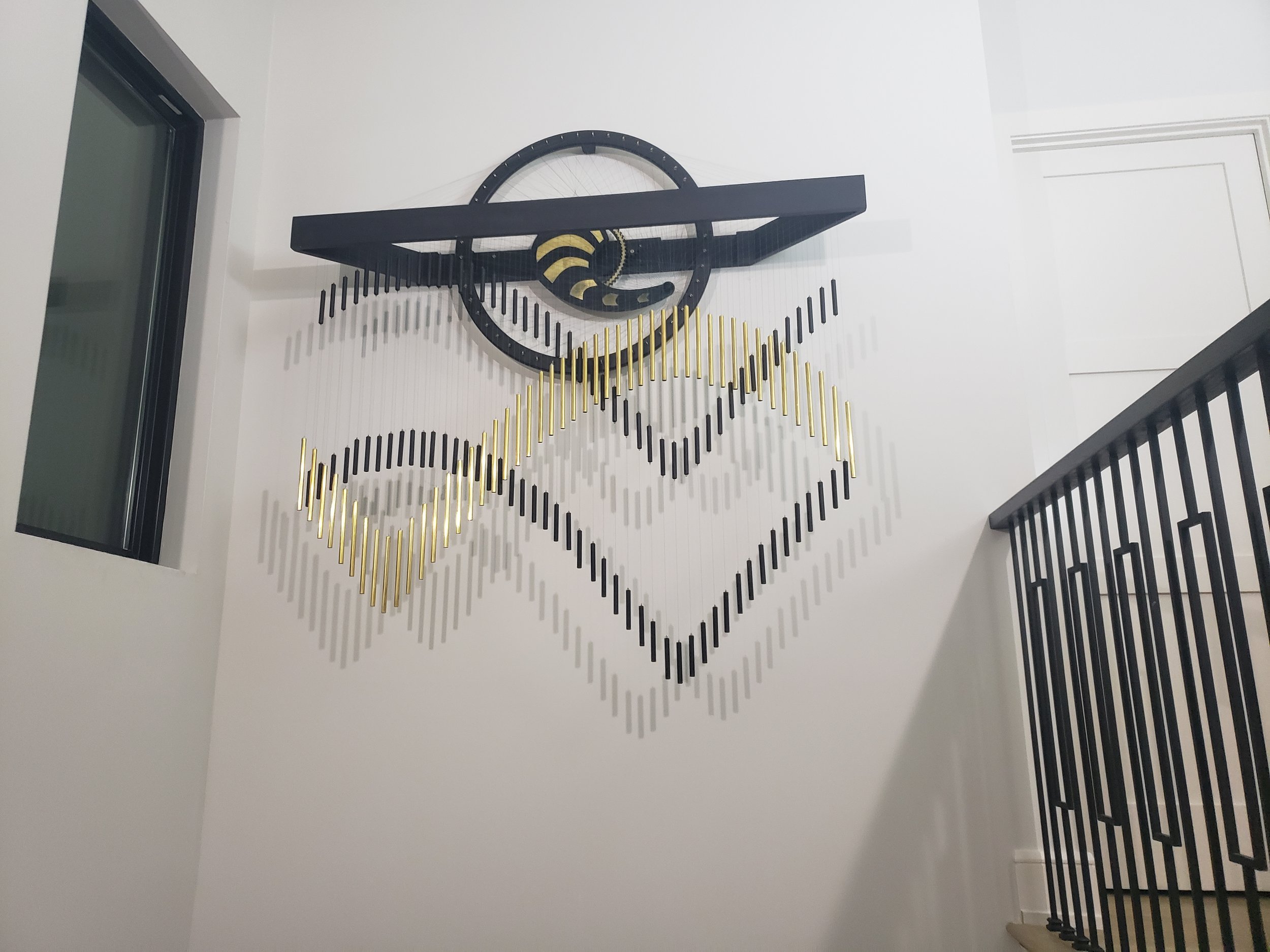 It is hung above a large stairwell, which made the installation a bit of a challenge, but the results are beautiful. I love the way that the light catches the brass wave as it is cresting, which adds another dynamic element to the piece.