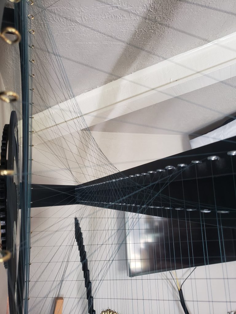 This project utilizes approximately 200 eye hooks, 150 brass tubes/ wooden dowels, and 300 yards of fishing line to form overlapping sine waves below the swimming Brass Beluga.
