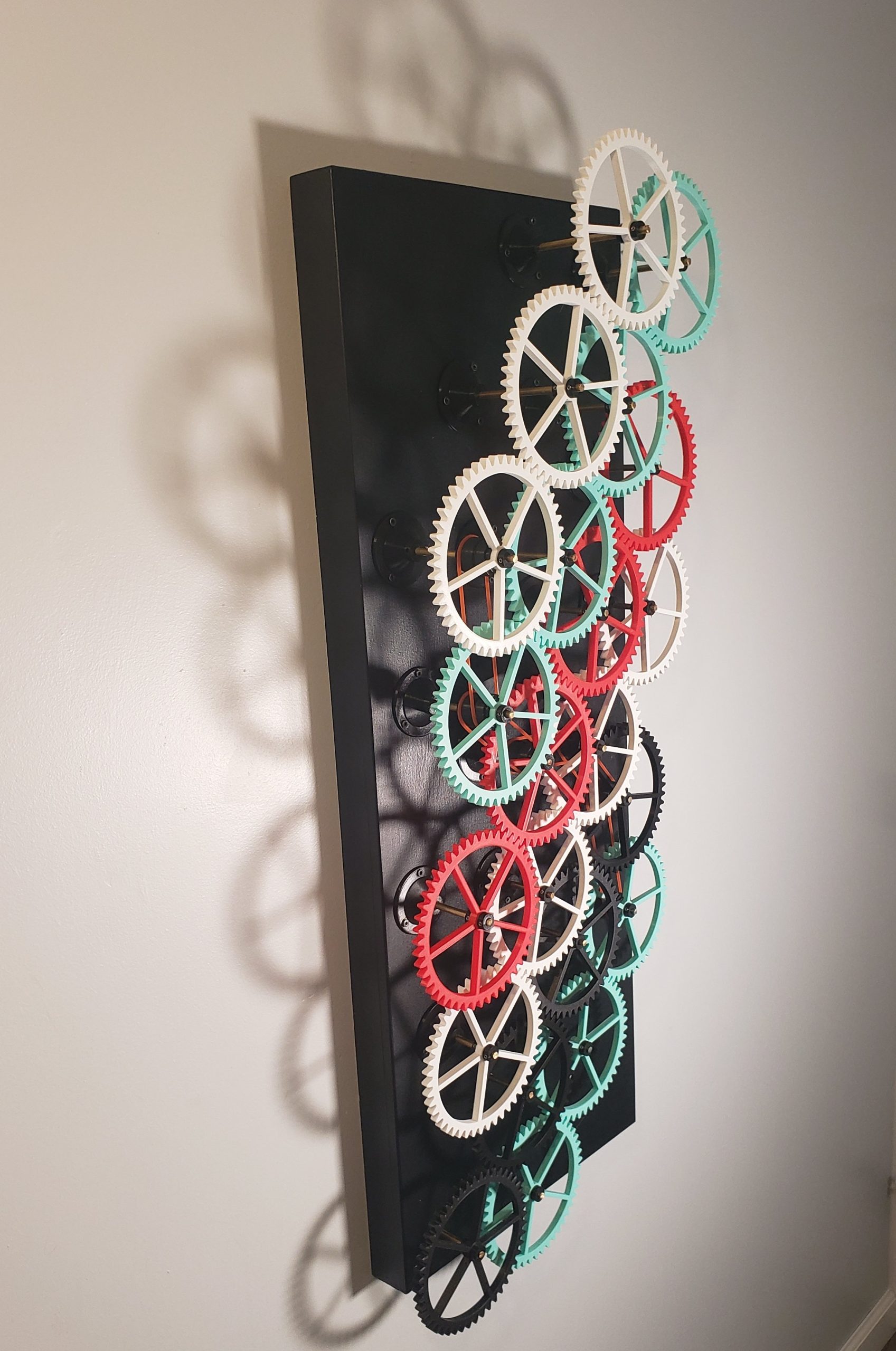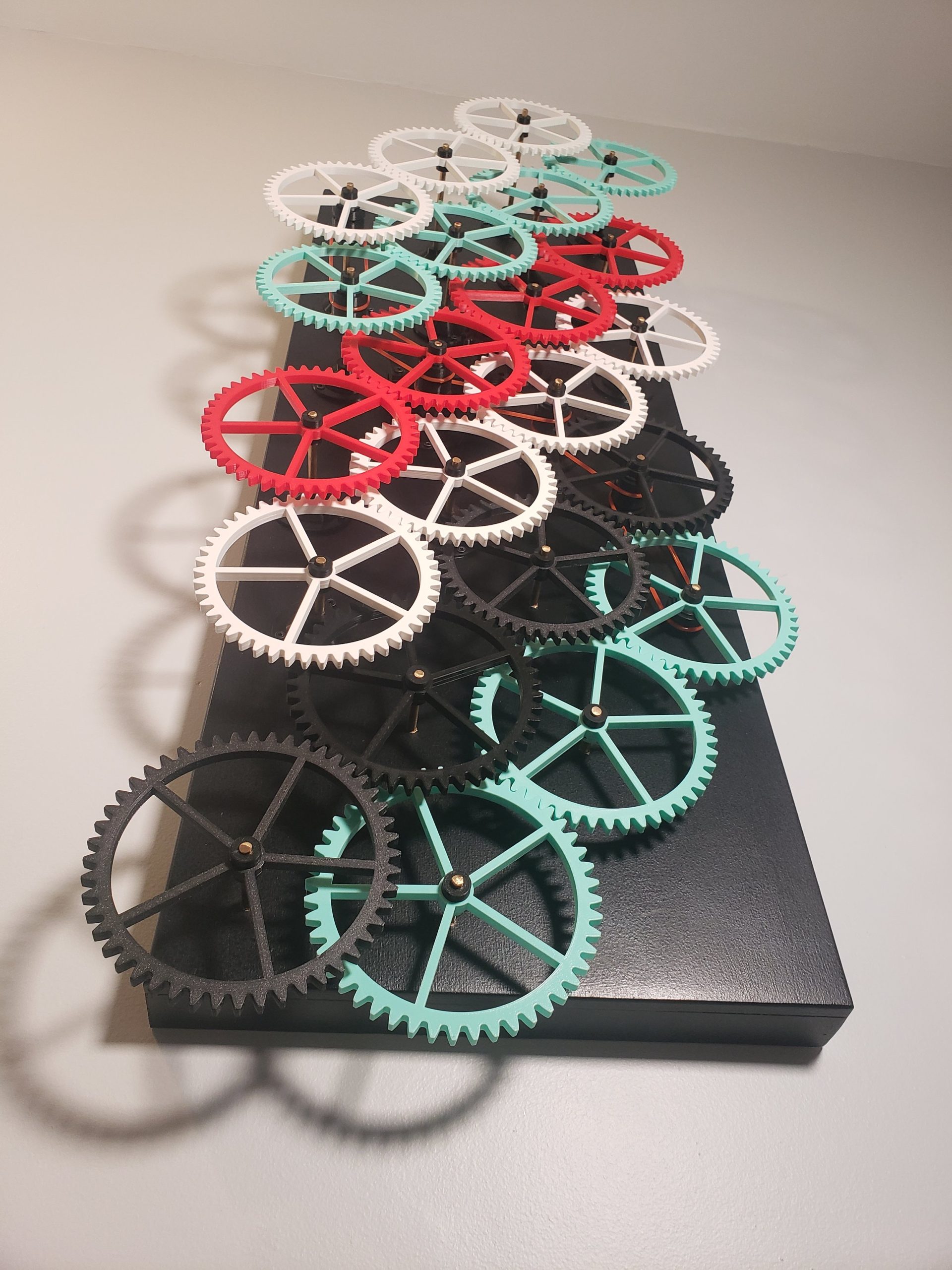 This piece is composed of 22 printed 6-in gears assembled in diagonal stripes. The gears are arranged where each row of gears meshes, and the rows are connected with a series of belts behind the gears that drive the whole assembly.