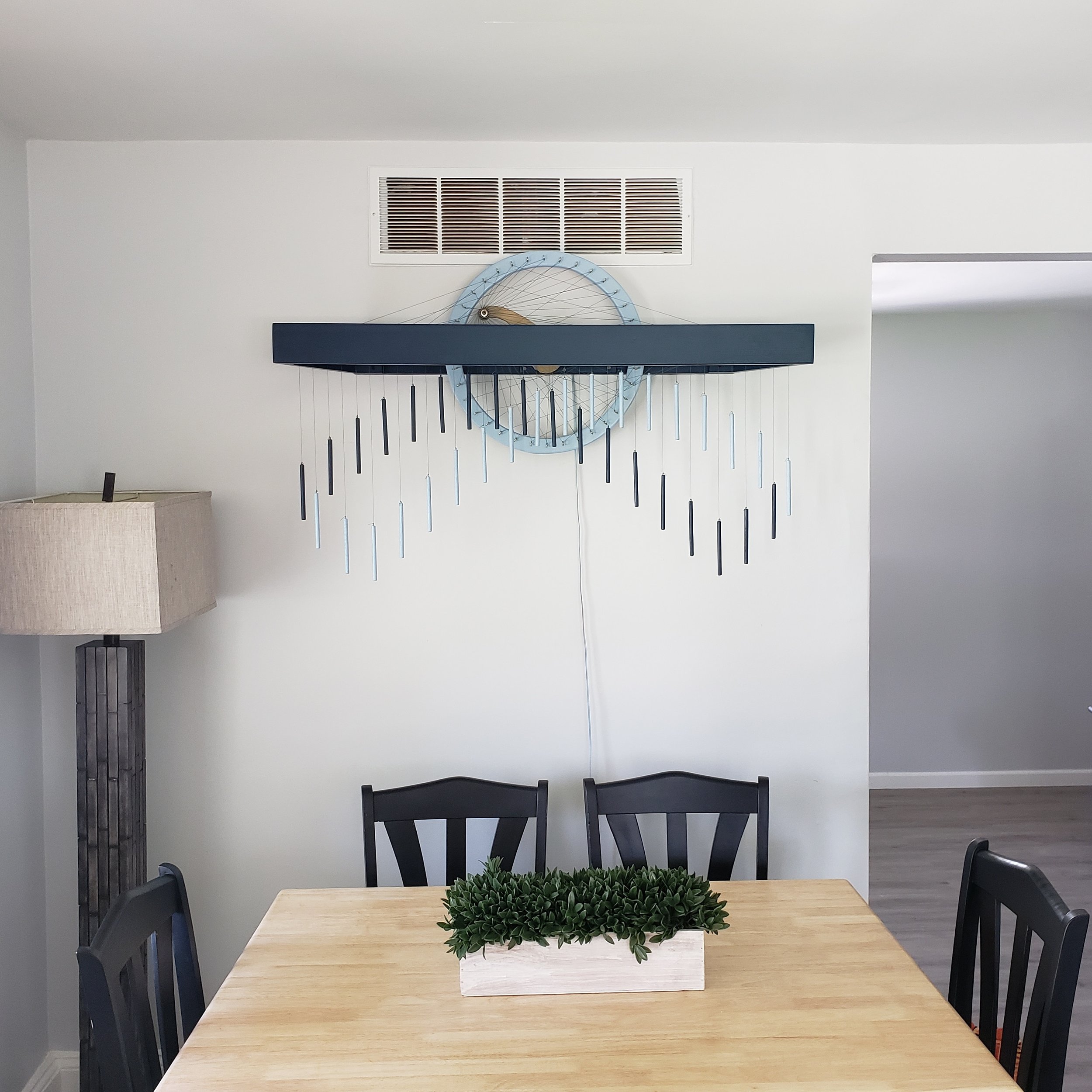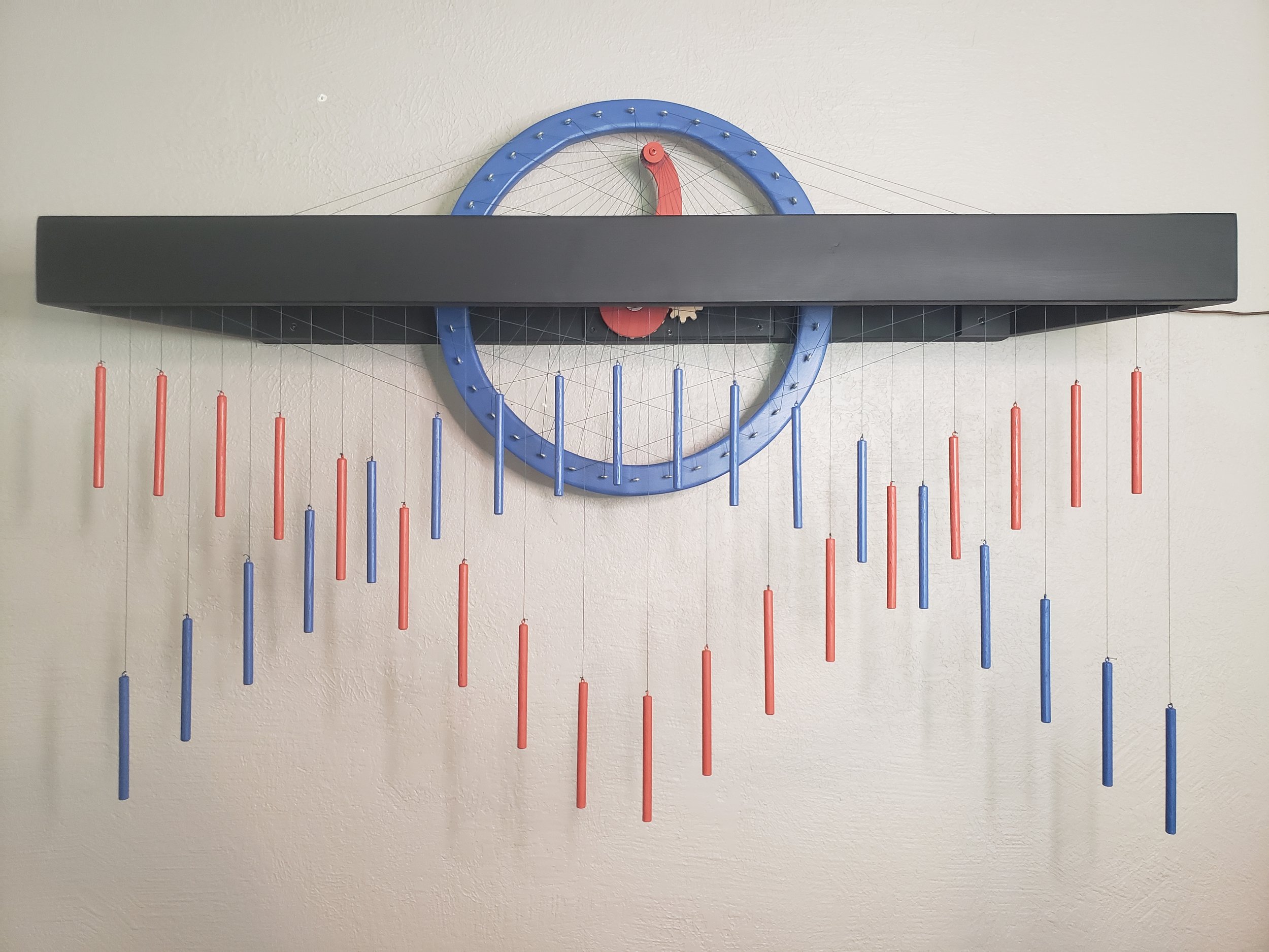 Sine Weaver was my first attempt at creating a wave sculpture. I really enjoyed the process of learning how conceptual trigonometry can be applied to a real world application. The bobbers are tied to a central knot and as that is moved around the circumference of the circle, a sine wave is formed.